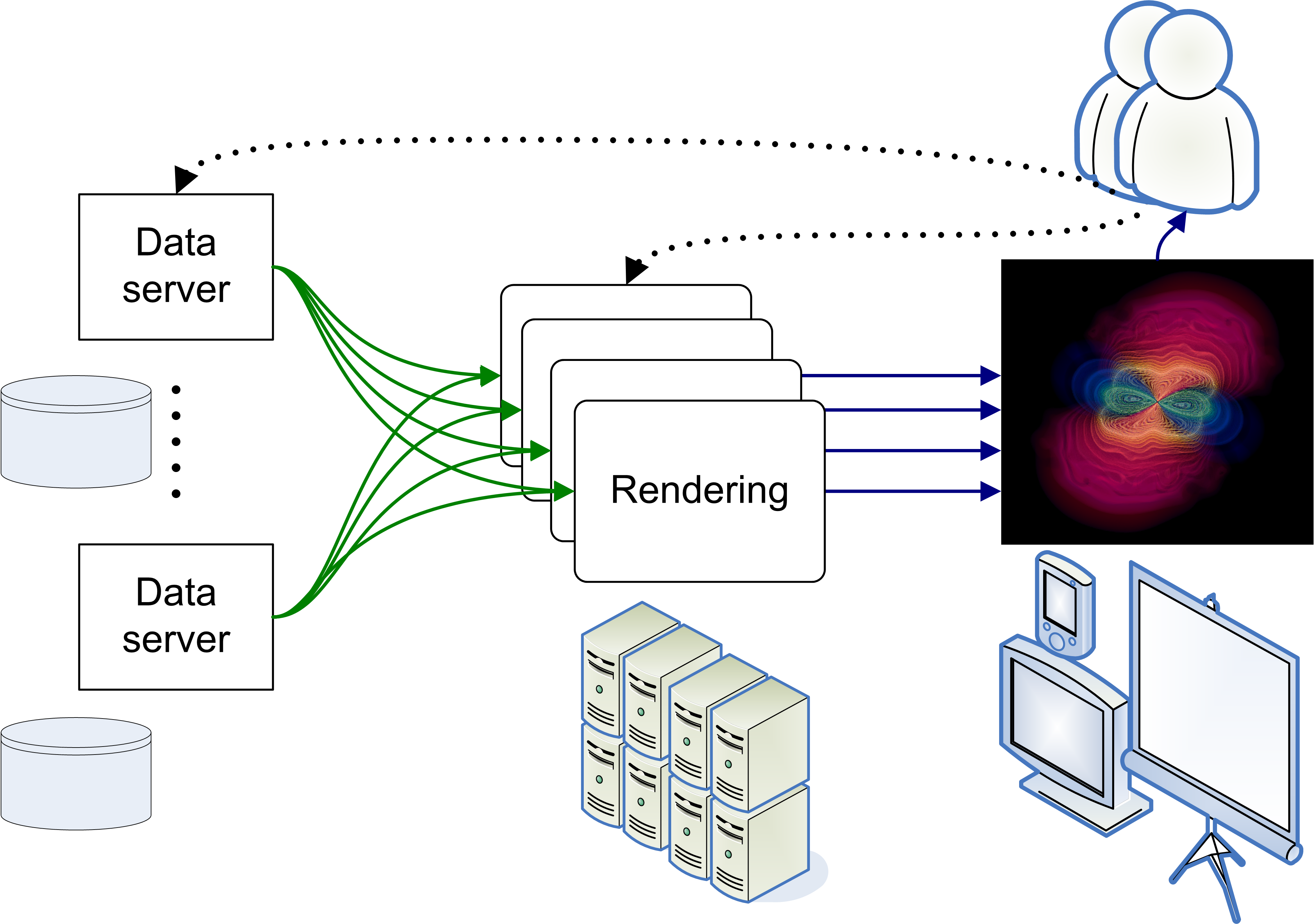 EAVIVThe EAVIV system is a research environment for experimenting with distributed visualization scenarios on high speed networks. The software components making up EAVIV comprises a distributed, efficient data server, a parallel GPU-based renderer (GeRender), and UDP-based image streaming to high resolution displays. Using visualization scenarios from the CyberTools science drivers, EAVIV is being used across LONI to investigate interactive visualization of large scale data sets. |